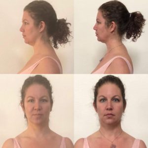In this before and after photo, we can see her head translate from roughly 1/2 an inch (1ish cm) off the centreline, back to centre and her forward head position reduced by roughly the same distance, back to a more stacked, more efficient position.